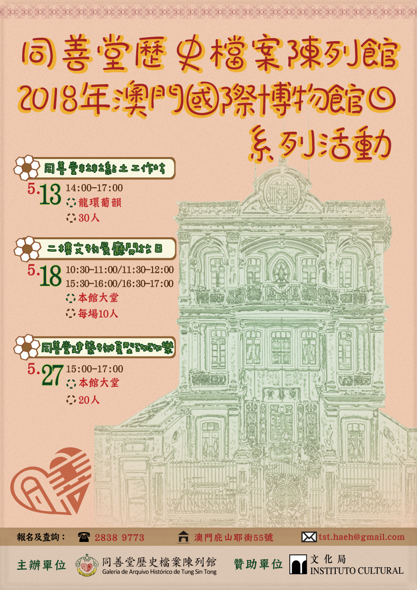 In order to celebrate annual “International Museum Day” on 18th of May which is set up by the International Council of Museums (ICOM), Tung Sin Tong Historical Archive Exhibition Hall will participate in the activities of “Macao International Museum Day Carnival, 2018” and launch a series of celebration activities in May. We are looking forward to your participation in the above series of activities.