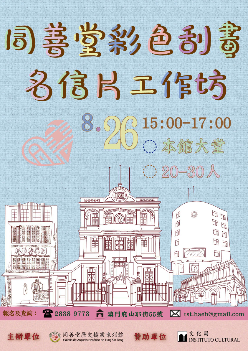 同善堂歷史檔案陳列館將於8月26日開辦「同善堂彩色刮畫名信片工作坊」活動,教導參加者運用刮畫工具筆在底紙上刻劃線條,利用色彩對比,創作刻有本館建築物、藥局建築物、司打口診所或崔德祺主席紀念樓,四座建築物輪廓的名信片。