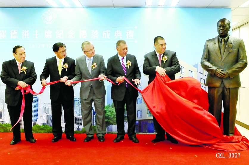 崔德祺主席畢生行善,積善成德。圖為二○一二年十二月十日行政 長官崔世安、全國政協副主席何厚鏵與時任中聯辦副主任徐澤等嘉賓 在主席許世元陪同下主持崔德祺主席銅像揭幕儀式。 |