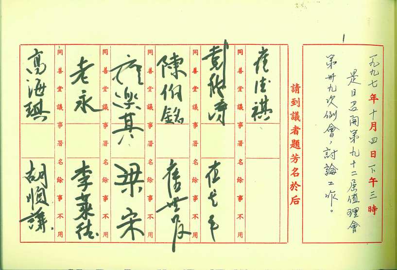 同善堂值理定期開會討論堂務,值理們出席以及對商定事項以簽名作實。圖為一九九七年同善堂值理出席署名簿。 |