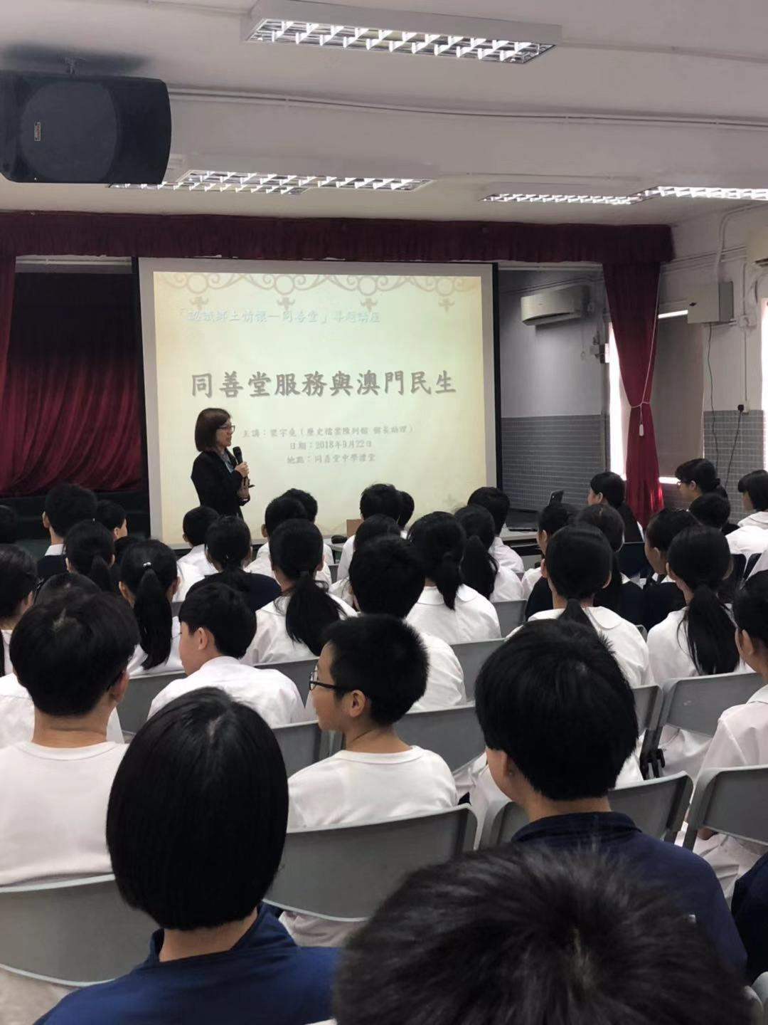 「愛國愛澳」系列——認識鄉土歷史文化情懷篇——「同善堂服務與澳門民生」講座 9月22日本館到同善堂中學進行「同善堂服務與澳門民生」講座,闡述本堂服務因應本澳時代及社會變遷所作的革新,讓學生從中了解本堂的服務發展歷史外,同時認識澳門的社會與民生情況轉變。