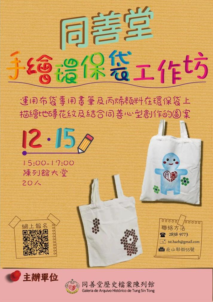 又到12月入冬時份,如果想找一家大小都適合參加的室內活動,12月15日不妨來同善堂歷史檔案陳列館參加「同善堂手繪環保袋工作坊」,一起動手用顏料裝飾環保袋再帶回家啦!活動限額20名,活動費用全免!如欲報名參加,請進入以下網址: