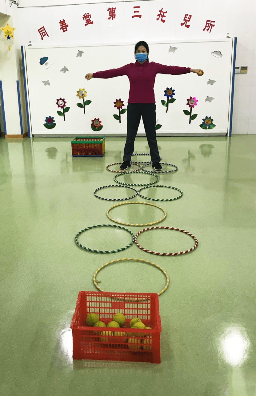02 如想嘗試進階版, 可參考右圖的佈置, 在起點及終點設置小球收集箱, 讓家中小寶貝邊跳邊運送小球到終點。 |